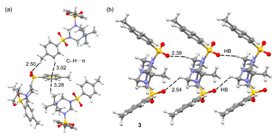 Compound 3 crystalizes in the monoclinic crystal system in the space group P21/n and, similarly to compound 1, also forms ternary assemblies where the same aromatic ring establishes C–H···π interactions at both sides of the ring, thus forming a C–H···π···H–C assembly (see Figure 4). This compound also forms 1D supramolecular chains in the solid state where the H-atoms of the triazinane ring interact with the O-atoms of the sulfonamide groups (Table S3), as shown in Figure 4b. The formation of this assembly is facilitated by the relative orientation of the p-methyl-benzene-sulfonamide groups.