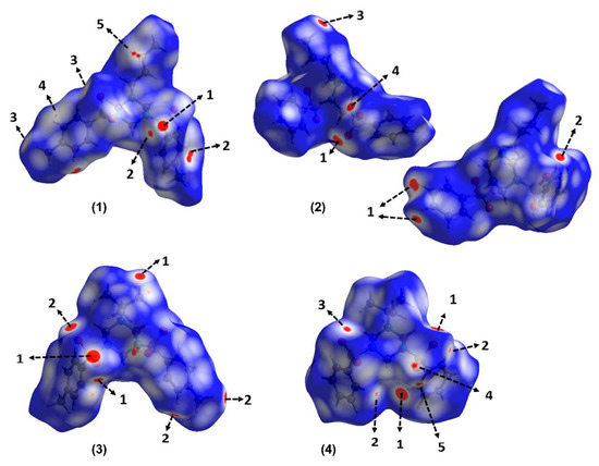 Hirshfeld surfaces mapped over dnorm function for compounds 1–4. The labels are discussed in the text. For compound (2), the second molecule is rotated by 180° around the vertical axis of the plot.