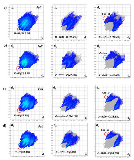 The Hirshfeld surface analysis is a very convenient tool for analyzing intermolecular interactions. The HS surfaces mapped over dnorm property are displayed in Figure 6 highlighting the main intermolecular interactions and scheme of labels. The patterns of intermolecular interactions are similar in all structures, which prompted us to evaluate the contributions of the weak non-covalent contacts in the supramolecular assembly, as well as the importance of C–H···π interactions in stabilization of the crystal packing. The 2D fingerprint plots (Figure 7) of the molecules illustrate significant differences between the intermolecular interaction patterns. The surfaces are shown as transparent to allow the visualization of the molecules. Contacts with distances equal to the sum of van der Waals (vdW) radii are represented as white regions and contacts with distances shorter than and longer than the vdW radii are shown as red and blue colors, respectively.