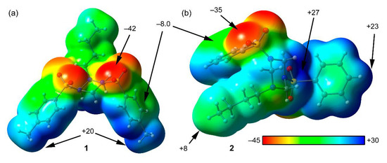 The DFT study is focused to analyze the supramolecular assemblies commented above in Figure 2, Figure 3, Figure 4 and Figure 5, where combinations of C–H···π and C–H···O H-bonding networks are commonly formed in compounds 1–4. First of all, the molecular electrostatic potential (MEP) surfaces of compounds 1 and 2 have been computed in order to analyze the electron rich and electron poor regions of the molecules. The surfaces are represented in Figure 8 and it can be observed that the most negative regions correspond to the O-atoms of the sulfonamide group. The N-atoms of the triazinane ring are not good H-bond acceptors, likely because either the lone pair is delocalized into the SO2-group, in accordance with the S2–N5 and S1-N3 bond lengths of 1.632(1) and 1.642(1) Å, respectively indicating a double bond character of these bonds. The most positive region corresponds to the middle of the three axial H-atoms of the triazinane ring (+27 kcal/mol). The aromatic H-atoms and the CH3 substituents also present positive MEP values (+23 and +20 kcal/mol, respectively). Finally, the MEP value over the aromatic rings is negative (−8 kcal/mol), thus adequate for establishing C–H···π interactions. The MEP analysis evidences that the most favored interactions from an electrostatic point of view are those involving the O-atoms as electron donors and either aromatic or triazinane protons as electron acceptors.