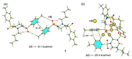 We have selected two supramolecular assemblies commented above in Figure 2 to analyze the energetic features of the H-bonds and C–H···π interactions in 1. The QTAIM distribution of critical points and bond paths are also given in Figure 9. The existence of a bond CP and bond path connecting two atoms is a good indicator of interaction [21]. For the self-assembled dimer (Figure 9a), in addition to the symmetrically related H-bonds (characterized by a bond CP (critical point) and bond path interconnecting the H and O-atoms), the QTAIM analysis reveals the existence of a π···π stacking interaction that further stabilizes the formation of the dimer. The dimerization energy is moderately strong (ΔE1 = −9.1 kcal/mol) due to the contribution of both H-bonds and the π-stacking. We have also analyzed the other motif, where C–H···π interactions are established. The interaction energy is very strong (ΔE2 = −20.4 kcal/mol), because in addition to the C–H···π contacts (two bond CPs and bond paths connect two aromatic H-atoms to two carbon atoms of the adjacent ring) an intricate network of H-bonds is established where six C–H···O and one C–H···N contacts are formed, which are highlighted in Figure 9b by yellow circles.