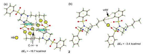 Figure 10a shows the self-assembled dimer of compound 2 where up to eight C–H···O contacts are established between either aromatic or aliphatic H-atoms and the O-atoms of sulfonamide (each one characterized by a bond CP and bond path, see yellow circles in Figure 10a). Moreover, two symmetrically distributed C–H···π interactions are also present and characterized by a bond CP and bond path connecting the aliphatic H-atom to one C-atom of the aromatic ring. As a consequence of this combination of interactions, the dimerization energy is very large ΔE3 = −16.7 kcal/mol, thus confirming the importance of this motif in the solid state of compound 2. Figure 10b shows a dimer extracted from the infinite 1D chain represented in Figure 3b. In this case, the interaction energy is modest (ΔE4 = −3.4 kcal/mol) because only one H-bond is established. The distribution of bond CPs and bond path also reveals the existence of van der Waals interactions between the alkyl chain and the aromatic ring.