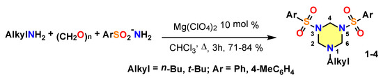 As it was mentioned above, the main objects of this work, N,N′-disulfamide substituted triazinanes 1–4, were prepared according to the method described in our preliminary communication [12] using the three-component Mg(ClO4)2 catalyzed condensation of arylsulfonamides with paraformaldehyde and n- or tert-butyl amine (Scheme 2, see the Supplementary Materials for detail of the experimental procedures and spectral data). The tert-butyl- and n-butylamines were chosen as the amino-components providing the highest yield of the target triazinanes.