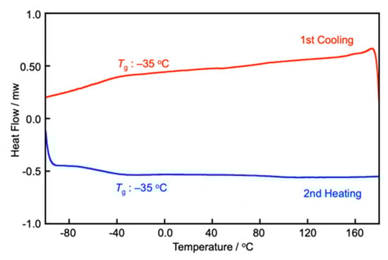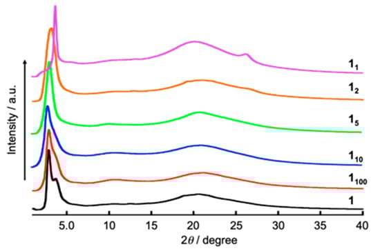 To investigate the LC properties, we carried out polarized optical microscopic (POM) observations, differential scanning calorimetry (DSC), and X-ray diffraction (XRD) measurements. At first, we synthesized 16 having four alkoxy chains. However, it was not found that 16 self-assembled into the formation of LC phase by measurements. In order to promote the self-assembling behavior of this framework, we designed the elongation of alky chains and substituted four hexyl chains with four dodecyl chains. The DSC measurement of 112 did not show a clear peak, due to a phase transition from a liquid-crystalline (LC) phase to an isotropic liquid at a scanning rate of 10 K/min on both first cooling and second heating in Figure 2. On the other hand, the POM observation in Figure 3 reveals that 112 shows a clearing point from a LC phase to isotropic liquid at 114 °C on the first heating. On the first cooling, annealing for 30 min at 110 °C brings about the formation of the LC phase in Figure 3. When the LC film of 112 applied into a sandwiched glass cell is sheared, this LC film can be aligned along to the shearing direction in Figure 3. POM observations reveal that the sheared LC film shows a bright and a dark image by 45° rotation. These observations indicate that 112 self-assembles into the formation of columnar (Col) LC phase, in which sheared columns are homogeneously aligned parallel to a glass cell. DSC and POM observation results indicate that 112 shows Col LC phase in a wide temperature range, including room temperature. Ong et al. have reported Col LC materials based on the similar HATN framework, which are composed of four alkoxy chains, as well as two triethylene glycol monomethyl ether chains [11]. Also, a glass transition of 112 are observed at −35 °C, according to the peak, due to phase transition from a Col LC state to a glass state in Figure 2. The XRD pattern of 112 shows two peaks in a small-angle region, with a broaden peak in a wide-angle region, due to molten alkoxy chains. These peaks can be assigned as the rectangular columnar LC (Colr) structure with a lattice constant (a = 48.0 Å, b = 41.5 Å) in Figure 5.