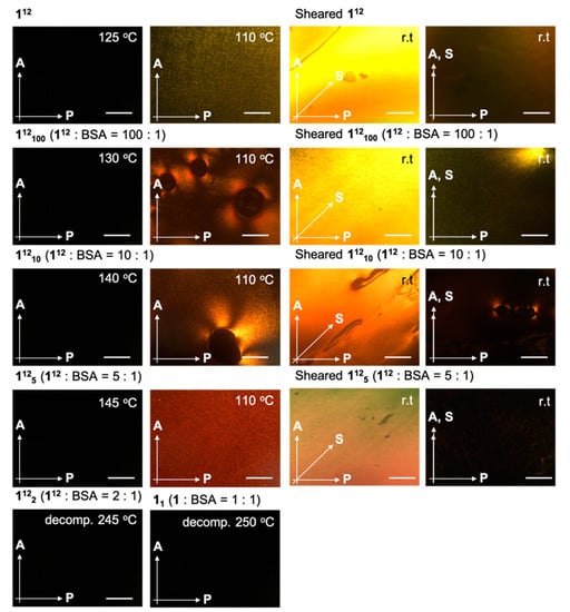 Polarized optical microscopic (POM) observations 1 and complexes of 1 with benzenesulphonic acid (BSA) for 112100, 11210, 1125, 1122, and 1121. All scale bars indicate 100 μm. A, P, and S indicate analyzer, polarizer, and sheared direction, respectively. 112100, 11210, 1125, 1122, and 1121 indicate 1: BSA = 100:1, 10:1, 5:1, 2:1, and 1:1 (in molar), respectively.