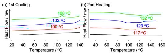 As for the addition of 112 with Na+ salt (NaI), which can be captured by 15-crown-5 moiety, we firstly carried out 1H NMR measurements to confirm the recognized behavior with metal ions by crown-ether moiety in Figure 6. In 1H NMR spectra for 112, the addition of NaI leads to an obvious change in the chemical shift and the broadening of the peaks, indicating that the complexation of 112 with NaI should occur. On the other hand, POM observation revealed that complex of 112 with NaI showed no birefringence characteristic of the LC phase, as well as decomposition before the melting point. As for complexation with KI, the broadening of the peaks due to crown-ether moiety was observed, however, the melting point was not changed compared with 112.