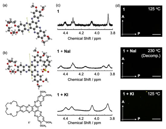 Density functional theory (DFT) calculations by using 1’ (a) and complex 1’ of with BSA (b). Arrows indicate dipole moments. (c) 1H NMR spectra and of 112 (top) and 112 with NaI (middle) and KI (bottom) in the range of crown-ether moieties and (d) POM observations of 112 (top) and 112 with NaI (middle) and KI (bottom).