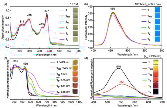 UV-vis absorption spectra and photographs in CHCl3 solutions (a) and in solid states (c) and fluorescent spectra and photographs in CHCl3 solutions (b) and in LC states (d) for complexes 16 with BSA.