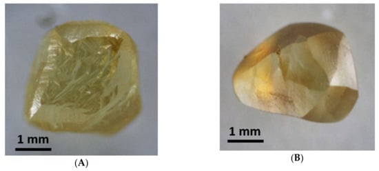 For the comparison, we used natural (untreated) diamonds selected from a collection of small (1–2 mm) diamonds from the Udachnaya kimberlite pipe, Yakutia. Details on how these diamonds were selected are given in Section 3.3.