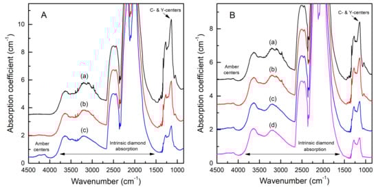 Recently, considerable attention has been paid to natural type Ib diamonds [,,,,,,,]. These diamonds are rare, accounting for less than 0.1% of natural diamonds []. Their evolution history differs from that of the majority of lithospheric diamonds, which has inflamed particular interest for researchers. Another interesting feature of natural diamonds with the type Ib character is that their infrared (IR) spectra in the defect-induced one-phonon region frequently cannot be described by the C and A components and show some additional absorption features [,]. Hainschwang et al. [] performed a detailed spectroscopic study of a large collection natural type Ib-IaA diamonds and conclusively identified a new absorption component in the one-phonon spectra. The defects responsible for this new absorption were called Y centers. Neither the nature of these defects nor their possible relation to other defects in diamond have been established so far.