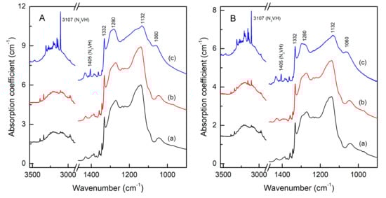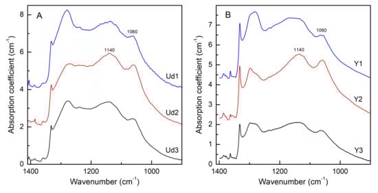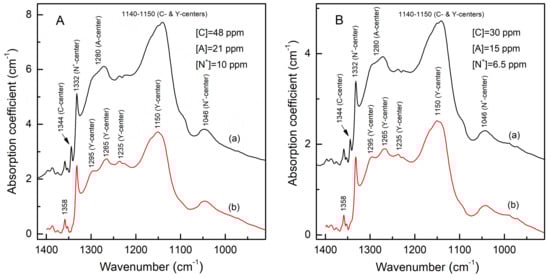 The one-phonon spectra taken from the locations with the dominating Y centers (traces (a) in Figure 2) are shown in Figure 3. It follows that the defect-induced one-phonon absorption is caused by a combination of absorption bands from C centers (isolated substitutional nitrogen with a principal band at 1130 cm−1 and a narrow peak at 1344 cm−1), A centers (nearest-neighbor substitutional nitrogen pairs with a principal band at 1280 cm−1), N+ centers (positively charged isolated substitutional nitrogen with a principal peak at 1332 cm−1 and a characteristic band at 1046 cm−1 [], and Y centers (a principal band at 1145–1150 cm−1 and a number of weaker peaks at 1235, 1265, and 1295 cm−1 []). The difference spectra obtained after the fitting and subtraction of the C- and A-form nitrogen from the recorded spectra were similar for the different samples and agreed reasonably well with the spectra assigned to the Y centers in the preceding studies [,]. It should be noted that the diamond samples selected for this study are relatively rare and in most cases the Y centers were present in the IR spectra of type Ib-IaA diamonds as a minor feature dominated by the nitrogen-related absorption.