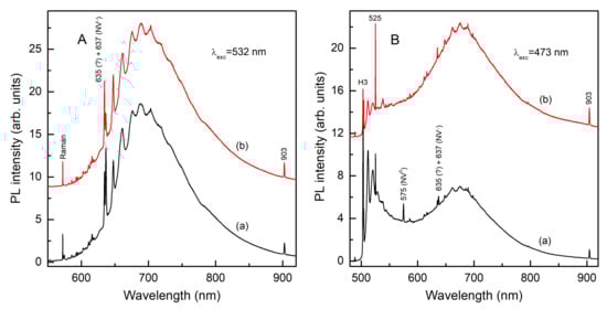 Let us now consider the photoluminescence characteristics of the initial diamonds. We found that the selected diamonds showed similar photoluminescence features, which, however, differed markedly depending on the sampling locations over the samples. Figure 4 shows the PL spectra recorded from sample Y1 from the areas where the Y centers dominated in the IR spectra. Under the 532-nm excitation, the dominant PL bands originated from the negatively charged nitrogen-vacancy (NV−) centers (zero-phonon line (ZPL) at 637.2 nm) and a vibronic system with a ZPL at 635.4 nm and a series of phonon-assisted peaks caused by the interaction of the electronic transitions with quasi-local phonons with an energy of 40 ± 1 meV. In addition, an array of weak peaks between 580 and 620 nm, and a narrow line at 903 nm were observed in the PL spectra. The 635.4-nm PL system was reported in previous studies of cubic diamonds from placers on the northeastern Siberian platform [,]. It is interesting to note that in an earlier paper by Van Royen and Palyanov [], a vibronic system with a ZPL at 634.8 nm replicated by 40 meV phonons was reported in the PL spectra of type Ib-IaA diamonds from African deposits. We believe that the ZPL position could be determined in [] with some uncertainty, and the 635.4-nm system observed in this work and preceding studies, and the 634.8-nm system observed by Van Royen and Palyanov [] correspond to the same optical center. Under the 473-nm excitation, the major PL signals were from the H3 centers (NVN, ZPL at 503.2 nm) and a broad band peaking at about 680 nm. An interesting feature found in this case is a vibronic system with a narrow ZPL at 525.4 nm and weak phonon replicas caused by coupling with quasi-local phonons with energies of 37 ± 1, 48 ± 1, and 57 ± 1 meV. Obviously, it is the same vibronic system as that reported by Zudina et al. [] (ZPL at 525.1 nm) for similar diamonds. Recently, a peak at 525.4 nm was reported to occur in the PL spectra of type Ib-IaA diamonds from Zimmi (West African craton) []. It is interesting to note that both for the diamonds studied in this work and diamonds from Zimmi, the occurrence of the 525.4-nm defects was restricted to central regions of the samples.