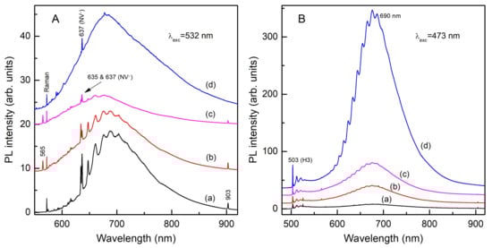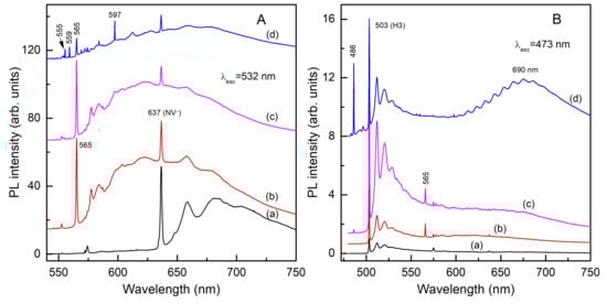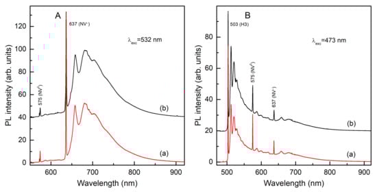 Photoluminescence (PL) spectra were measured using a custom-built setup based on a Horiba JY iHR320 monochromator (Horiba Jobin Yvon S.A.S., Lonjumeau, France) equipped with a Syncerity CCD detector. Gratings with 2400, 1800, and 600 grooves/mm were selected from the turret depending on the desired spectral resolution and/or spectral range. Photoluminescence was excited using continuous-wave lasers operating at 473 and 532 nm. An achromatic lens with a focal length of 60 mm was used to focus the laser beam (to a spot of ~20 µm in diameter) onto the sample and to collect photoluminescence signal. Proper optical long-pass edge filters were placed between the collecting lens and a lens (f = 120 mm) focusing PL emission onto an entrance slit of the monochromator. A Linkam FTIR600 heating/freezing stage (Linkam Scientific Instruments, Tadworth, UK) mounted on an XYZ translation stage was used for the low-temperature measurements. The optical scheme also involved an additional switchable channel equipped with a digital camera, allowing for visualization and control of the laser spot position over the sample. Most of the PL spectra presented in this paper were normalized to the intensity of the first-order Raman peak of diamond, which permitted the semi-quantitative comparison of the PL spectra recorded before and after the annealing experiments. In several cases, normalization to the Raman peak intensity was not possible due to the very high intensity of the photoluminescence signal and the spectra were compared with reference to the experimental parameters (excitation laser power, acquisition time, etc.).