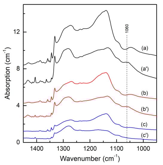 Infrared spectra recorded from different zones of sample Y1 (a,b,c) before and after (a’,b’,c’) annealing at 2100 °C. The spectra were arbitrarily offset, but the absorption scale was identical for all spectra.
