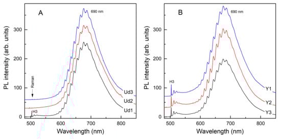 The results presented in the preceding sections show that HPHT treatment of natural type Ib-IaA diamonds containing Y centers produces significant changes in their infrared and photoluminescence spectra. The most striking results were found for the cases when the Y centers dominated. Annealing at 2100–2200 °C resulted in a drastic change of the infrared one-phonon spectra and the development of the 690-nm red luminescence band. This band has been frequently observed in the photoluminescence of specific natural brown diamonds that are thought to have some type Ib characteristics [,,]. Therefore, it is of interest to compare the IR spectra of the diamonds annealed in this study with the spectra of naturally occurring red-luminescing diamonds. For this purpose, we examined a suite of small diamonds (1–2 mm) from the Udachnaya kimberlite pipe, Yakutia. A number of diamonds showing intense red luminesce under a blue light excitation were picked out and their PL and IR spectra were recorded. Figure 10 (panel A) shows the PL spectra recorded for the selected diamonds, denoted as Ud1, Ud2, and Ud3, and for the Y-center-rich diamonds annealed in this work (panel B). As it can be seen, the spectra are very similar, being dominated by the 690-nm band. The IR spectra of the Ud1–Ud3 diamonds are shown in Figure 11, panel A. In panel B, we show the IR spectra obtained in this work, from which the C center component was subtracted. It follows that the spectra of the red-luminescing natural diamonds and HPHT-treated diamonds containing the Y centers look similar, showing a common absorption feature at 1060 cm−1. We can conclude that the well-known 690-nm red emission band and the specific IR absorption band at 1060 cm−1 are genetically related to the Y centers. An intriguing question is what is the nature of the defects and/or impurities responsible for these features? It was hypothesized that the 690-nm red luminescence band and therefore the Y centers could be related to oxygen impurities [,,]. This hypothesis awaits experimental confirmation using mass-spectroscopic and other techniques.