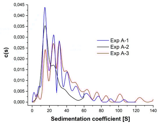 Analysis of these experiments was performed with SEDFIT at a wavelength of 510 nm, as SEDFIT does not offer the possibility for multiwavelength analysis. The tool available for band forming experiments assumes ideal initial conditions and is not optimized in the same way as the tools for the sedimentation velocity (SV) experiments. Accordingly, the deviation between model fit and experimental data (RMSD) is always higher compared to SV datasets. The results for analysis of experiment A and two repetitions (A-1, A-2, A-3) are shown in Figure 2, the corresponding fits are shown in Supplementary Materials Figure S2.