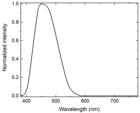 How the blue light influences our circadian rhythm has been studied intensively [,,]. Under ambient light, the intrinsically photosensitive retinal ganglion cells (ipRGCs) innervating the suprachiasmatic nucleus (SCN) can affect melatonin secretion, which in turn alters the circadian rhythm []. According to experiments on light-induced melatonin suppression, the action spectrum of the circadian effect with a peak at blue wavelength has been proposed [,], as plotted in Figure 1. From this curve, we can see that blue light with a wavelength of 450–460 nm has the strongest influence. There are several parameters we can use to quantify this effect, including circadian action factor (CAF), circadian luminous efficacy (CLE), circadian efficacy of radiation (CER), and circadian illuminance (CIL). They all quantify how much light perceived by human eye can contribute to the circadian effect. From Equations (1)–(3), it can be seen that they are quite related. Here, LER stands for the luminous efficacy of radiation, LE is luminous efficacy, and VIL is visual illuminance. If we take CAF as an example, usually at daytime, we would need a larger CAF value, while we would need a smaller CAF value to follow the circadian rhythm at nighttime.