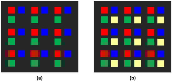 An example of pixel arrangements of (a) three-color micro-light-emitting diode (LED) displays and (b) four-color micro-LED displays.