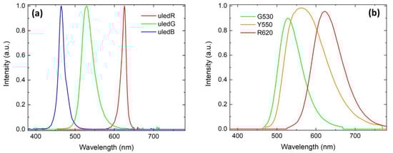 (a) Measured RGB (red, green, and blue) micro-LED spectra from PlayNitride []. (b) Spectra of some commercial phosphors.