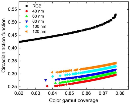 The result plotted in Figure 4 shows that there is a tradeoff between the CGC and the CAF. It is also worth mentioning that the introduction of the 3000 K white subpixel should not influence the color gamut such that the highest CGC is the same for all the cases. Interestingly, compared to RGB-type micro-LED displays, the RGBW-type micro-LED displays can achieve a much lower CAF. As the bandwidth of the phosphors gets narrower, the CAF is lower when the color gamut remains the same. This may be somewhat contradictory to expectations at first glance because one may think a continuous spectrum would be more natural and should exhibit a lower CAF. However, the action spectrum mainly focuses on the blue and cyan colors. When the bandwidth of yellow color gets narrower, the ability to tailor the spectrum is higher, which enables a better design to reduce the overlapping with the action spectrum. Given that the CAF of a 3000 K blackbody radiator is around 0.43, an 87% Rec. 2020 RGB-type micro-LED display would have a higher CAF (~0.49). However, by using yellow phosphors whose bandwidth is as broad as 120 nm, the CAF can be reduced to ~0.33, which corresponds to a 33% decrease in comparison with the RGB-type.