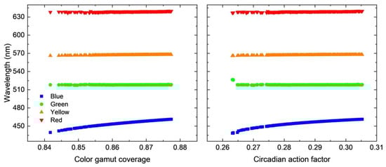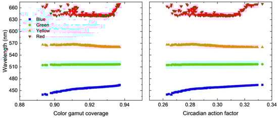 An advantage of the systematic optimization is that the parameter preference, as well as the correlations between each input parameter and each objective, can be studied. As an example, here we investigated a quite realistic case where the FWHM of the yellow phosphor was 60 nm. Figure 5 shows the relationship between the objectives (CGC and CAF) and the central wavelengths of RGB micro-LEDs and the yellow phosphors. As noticed, for all the optimal solutions, the central wavelengths of red and green micro-LEDs and the yellow phosphor stayed almost the same at around 639 nm, 518, and 567, respectively. The central wavelength of the blue LED became the determining factor of both CGC and CAF, where a longer blue wavelength led to a larger CGC but also a larger CAF.