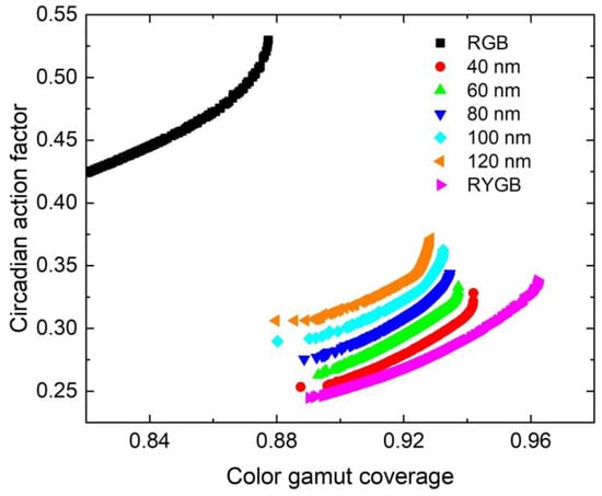 In comparison with RGBW-type micro-LED displays, the RYGB-types could achieve a wider CGC because four primary colors were used. The Pareto front is plotted in Figure 6. Similarly, there was a tradeoff between CGC and CAF, and the RYGB-type micro-LED displays could achieve a much lower CAF than the RGB-type. As the bandwidth of phosphors got narrower, CAF could achieve a lower value while CGC could be larger. By comparing to the cases with phosphors, it could be seen that the CGC of pure micro-LEDs could achieve a much higher value because the bandwidth of yellow micro-LED was much narrower than that of the yellow phosphor. We need to point out that in our simulations, we assumed the yellow micro-LED had the same line shape as the red one, but this assumption may not hold in real cases. However, when the line shape of yellow LED was broadened, we can see from Figure 6 that the maximum CGC decreased and the minimum CAF increased.