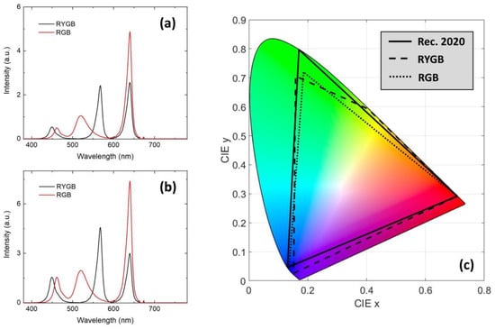 To obtain a yellow subpixel, we could use a yellow micro-LED chip directly or a phosphor-converted blue micro-LED with complete down-conversion. On the other hand, a yellowish white subpixel could be realized by designing a phosphor-converted blue pixel with incomplete down-conversion. For both RGBW and RYGB four-color micro-LED displays, a lower circadian effect and a wider color gamut are desirable. Rec.2020 is a color space specifying various aspects of ultra-high-definition televisions with a wide color gamut []. Here, we used CAF as the indicator of the circadian effect and calculated the color gamut coverage (CGC) in Rec.2020 standard, specifically by: