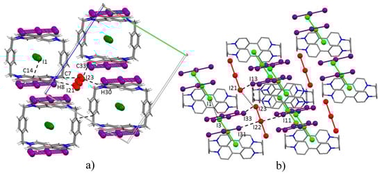 A third I3− is found to occupy the pillar cavity, hosting one of its I atoms within the BB frame. As a result, looking along the a direction, a wire of triiodides passing through BB molecules spans the whole crystal. The fourth non-equivalent I3− anion is also organized in wires passing in between adjacent BB pillars. Figure 2 offers a complete view of the crystal packing. Contact distances according to the labelling scheme of Figure 1 and Figure 2 are reported in the Supplementary Materials (Table S2).