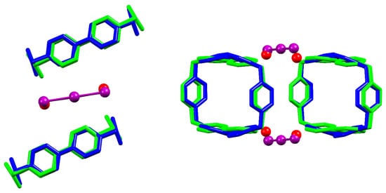 The (BB)I4.8H2O crystal structure allows instead for comparison of the mutual positions of BB and hosted I− or I3− anion. As shown in Figure 4 for both non-equivalent BB molecules found in (BB)I4·8H2O (termed molecule A and molecule B) [27], it is observed that the position occupied by the iodide anion is almost coincident with the position of the central atom of the triiodide. This does not appear fortuitous, as this atom is formally the charge-bearing one, indicating that the charge-charge component of the piridinium-I3− anion-π contact is the most significant for the host-guest interaction.