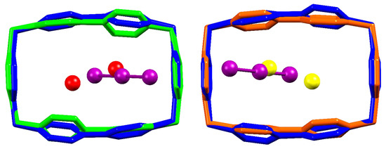 Comparison of host-guest interaction for BB…I3 in I3@BB(I3)3·2DMSO (blue and violet) and BB…I− in (BB)I4·8H2O (green and red: molecule A; orange and yellow: molecule B). Superimposition obtained by overlap of the four C atoms of BB methylenic corners (RMS = 0.110 and 0.057 for molecule A and B, respectively).