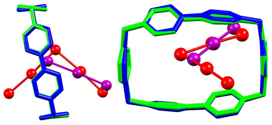 Side and front comparisons of host-guest interaction for BB…I3 in I3@BB(I3)3·2DMSO (blue and violet) and BB…I5− in I5@(BB)(I3)3 (green and red). Superimposition is obtained by overlap of the four C atoms of BB methylenic corners (RMS = 0.0617).