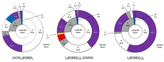 Results of the analysis for (ACN)2@(BB)I4, I3@(BB)(I3)3·2DMSO and I5@(BB)(I3)3 crystal structures are reported below in Figure 7 and Figure 8.
