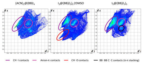 As shown in Figure 8, and better detailed in Figure S1, in the case of (ACN)2@(BB)I4, main BB…I contacts are of the H…I type, giving rise to the classic tip-like feature expected for H-bond type interactions. A minor contact-dense zone related to C…I, i.e., pyridinium-I− anion-π interaction, is also manifest [27]. As we move towards polyiodide-based structures, the predominance of CH…I contacts and H-bonds is gradually reduced, together with the anion charge density. Polarizability and size of the anion increases, and so does the relevance of stabilizing contributions that can take advantage of it; in this case, anion-π interactions. The defined sharp H-bond tip observed for H…I contacts in (ACN)2@(BB)I4 gets smeared and blurred the more we move towards I5@(BB)(I3)3, while at the same time, the relevance of anion-π contacts, just glimmering in the (ACN)2@(BB)I4 fingerprint, become a major feature. I3@BB(I3)3·2DMSO indeed appears as a bridging instance between these two different trends, showing similarities with both I− and I5−-based structures.