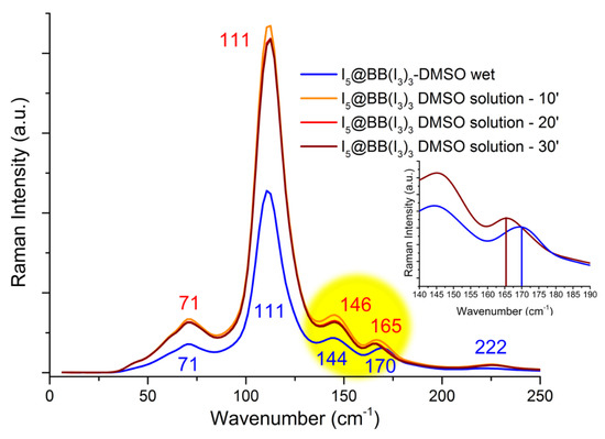 Raman spectra of the DMSO-soaked I5@(BB)(I3)3 were re-recorded in the very same manner as in [26] and showed analogous results. This time, however, spectra were recorded from the initial wetting of the crystals for up to 30 min (after which no further changes were observed) while crystal dissolution in DMSO proceeded; data are reported in Figure 10.