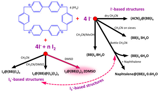 Overview of reported crystalline phase for the binary blue box (BB)/I− [27] and ternary BB/I−/I2 [28] systems. The two subgroups of I−- and I5−-based structures were hardly relatable, due to the lack of an intermediate I3−-based architecture. The I3@(BB)(I3)3·2DMSO crystal structure herein reported fills the gap allowing substantial comparison of packing features. Adapted from [27] with permission from John Wiley and Sons.