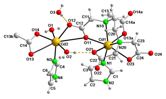 3.3.1. {[Cd(µ3-EDTA)(Him)·Cd(Him)(H2O)2]·H2O}n (1)