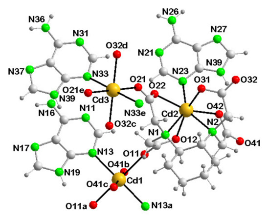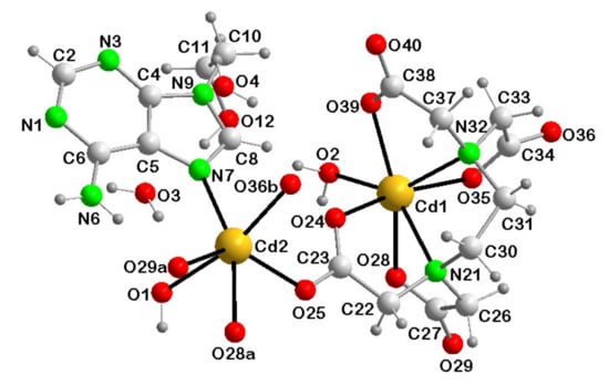 3.3.2. [Cd(µ4-CDTA)(Hade)·Cd(Hade)2]n (2)