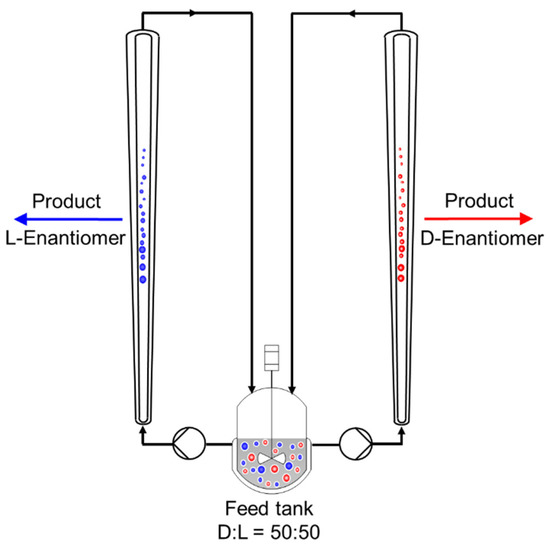To increase robustness, productivity, and yield of the classical variant, two opposite Preferential Crystallizations can be carried out in two vessels only connected via a continuous liquid phase exchange [16]. In this way, the selective removal of the enantiomers in the respective crystallizer is counterbalanced and a racemic liquid phase composition maintained, which reduces the risk of nucleation.