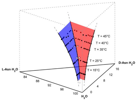 Upper 20% section of the ternary phase prism of the asparagine monohydrate enantiomers in water at different temperatures. All axes are given in mass fractions × 100 (wt%). Black and white dots—solubility data from [18] and [19], respectively. Red and blue surface—fitted solubility surface of D-Asn·H2O and L-Asn·H2O, respectively. Reprinted with permission from [19]. Copyright 2020 American Chemical Society.