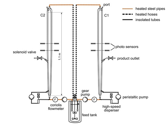 All separation experiments were performed in the setup shown in Figure 3. The plant consisted of two tubular crystallizers (C1 and C2, Figure 3) with an individual volume of approximately 0.5 L and a total height of 1130 mm. Each double-jacketed tubular crystallizer was composed of a conical section in the lower part and a cylindrical section in the upper part of the columns. Thus, the fluid velocity of a liquid phase passing through the crystallizers changes with the height of the columns due to the increasing diameter in the conical section. At the transition between the upper and lower section, where the diameter is the largest, the fluid velocity becomes constant again over the height of the cylindrical part.
