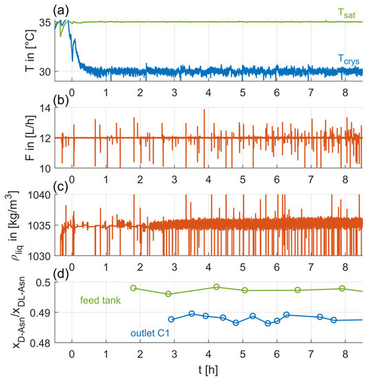 Evolution of the saturation temperature, Tsat, crystallization temperature, Tcrys (a), volumetric flowrate (b), liquid phase density of the feed solution, ρliq (c), and enantiomeric proportion of the D-Asn∙H2O in the liquid phase at the crystallizer outlet and within the feed tank (d), of Exp. 7 (C1) over time, with t = 0 indicating the initial seeding point. Spikes occurring in the flowrate and solution density courses can be attributed to air bubbles passing the Coriolis mass flowmeter (data shown are raw data without any curve treatment).