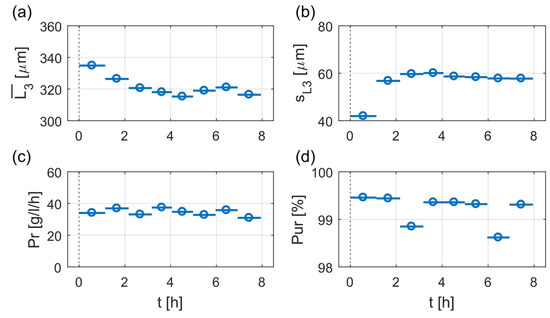 The temporal evolution of the above introduced process performance parameters, product crystal mean size, , standard deviation of the product crystal size distribution, sL3, and productivity, Pr, are illustrated in Figure 6 for Exp. 7. As shown in Figure 6, all process performance characteristics reached almost constant values after approximately 2 h process time. During the following 6 h operation time the mean product crystal size varies between 315 to 321 µm with a respective standard deviation between 57 and 60 µm. The calculated productivities range in the same time between 30 and 37 g/L/h, while the product purity exceeds 98% for the whole experiment.