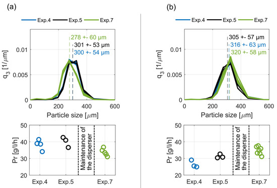 Steady-state crystal size distributions, q3, with their respective mean values and standard deviations, as well as the corresponding productivities, Pr, of crystallizer C2 (a) and C1 (b) for Exps. 4, 5, 7.