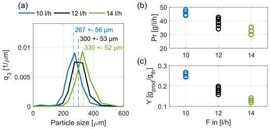 Mean steady-state crystal size distributions, q3, with their respective mean values and standard deviations (a), productivities, Pr (b), and yields, Y (c), for three different volumetric flowrates, F = 10, 12, and 14 L/h. Given results are from crystallizer C2 for Exps. 4 and 5.