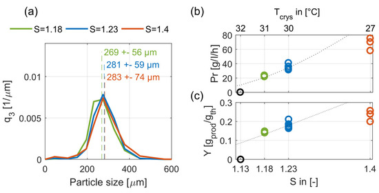 The steady-state results of the applied supersaturations are presented in Figure 9 regarding the product crystal size distributions and their characteristics (Figure 9a), productivity (Figure 9b), and yield (Figure 9c). As depicted in Figure 9a, the influence of the supersaturation on the product crystal size is negligible, which again verifies the classifying effect of the fluidized bed. The standard deviation of the product crystal size distribution increases slightly at higher supersaturations. Figure 9b,c shows that the supersaturation clearly enhances both productivity and yield, which correlates with the growth kinetics (dotted lines) of the given substance system [19].