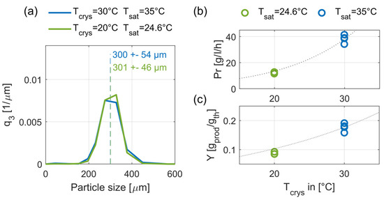 As seen in Figure 10a, an influence of the crystallization temperature on the product crystal size was not observed. At the lower crystallization temperature, the standard deviation decreases by almost 15%, hence, the selectivity of the size classifying effect is improved. Since the crystal growth rate decreases with the crystallization temperature, the crystal growth and the standard deviation show the same correlation as in the previous section. This correlation leads to the assumption that the crystal growth counteracts the size-classifying effect and thus its selectivity. The influences of the crystallization temperature on productivity and yield are depicted in Figure 10b,c. As expected, a lower crystallization temperature leads to both lower productivity and yield. The observed decreases of productivity and yield are in good agreement with the studied correlation between crystal growth kinetics (dotted lines) and crystallization temperature [19].