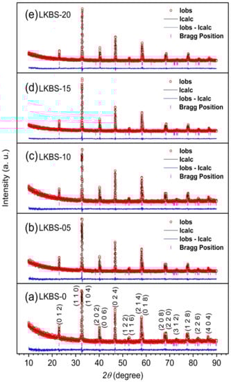 Substitution with K+ ion is observed to slightly reduce the unit cell volume. This can be correlated with the increasing concentration of Mn4+ ion, which has the smallest ionic radius within the samples, due to the substitution of La3+ by K+ ion. Similar cases where the unit cell volume of LMO-based compounds decreased due to substitution by larger ion have been observed by Shaikh and Varshney in La1−xKxMnO3 (x = 0.1; 0.125; and 0.15) compounds and Chebanee et al. in La0.65Ce0.05Sr0.3Mn1−xCuxO3 (0 ≤ x ≤ 0.15) compounds [,]. Substitution by K+ ion also increases the from 1.243 to 1.310 for LKBS-0 and LKBS-20, respectively. This, in turn, causes the values of Goldschmidt tolerance factor, , and to have an increasing trend from 0.930 to 0.965 and 3.833 × 10−3 to 18.101 × 10−3, respectively.