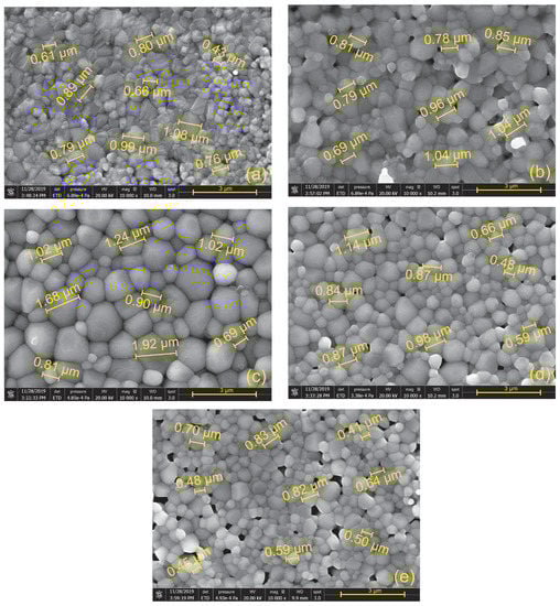 The difference in the crystallite size and the grain size observed from SEM measurement can be explained in terms of the method to determine the crystallite size of the sample. Zhou and Greer mentioned that the calculation of crystallite size from powder diffraction pattern will be in good agreement with the grain size observed from an electron microscope (either SEM or TEM) when the particle size of the sample is within the nanometer scale []. This is clearly not the case in the present work. Additionally, Uvarov and Popov also proved that in cases where two different crystal sizes exist—big crystals several microns in size and small crystals with a size of around 100 nm—the powder diffraction pattern would tend to detect only the presence of the small crystals []. Although the crystallite size of the samples reaches a resolution that can be detected through SEM measurement, it can be seen that the smallest grain size that can be seen in Figure 2 is 0.4 μm. This result indicates that each grain observed with SEM measurement comprises a secondary grain, which has aggregated into a single large grain. To determine this secondary grain, more sophisticated measurements, such as Atomic Force Microscopy (AFM) and Lateral Force Microscopy (LFM), will be needed [].