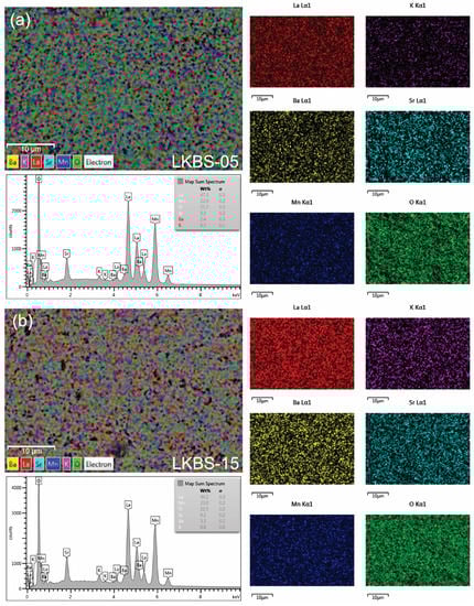 To confirm the existence of K+ ion in the samples, EDX analysis together with elemental mapping analysis was performed. The elemental maps for each sample also demonstrate that each element is distributed evenly in the samples, hence proving that the sample has a high homogeneity. The elemental mapping of K+ ion for LKBS-15 sample is brighter compared to LKBS-05. This proves that the concentration of K+ ion in LKBS-15 sample is indeed higher compared to LKBS-05 sample. It is noteworthy to mention that the collection time in the elemental mapping of K+ ion in LKBS-15 sample is shorter than LKBS-05. This result suggests that the concentration of K+ ion in LKBS-15 sample is higher compared to the LKBS-05 sample, and the measurement result was not influenced by the collection time. Representative EDX spectra and elemental maps of LKBS-05 and LKBS-15 samples shown in Figure 3 ensure that K+ ion was successfully substituted inside the samples. EDX quantitative analysis further confirms that K+ has been successfully substituted in the samples. The results of EDX quantitative analysis for La0.8−xKxBa0.05Sr0.15MnO3 (0 ≤ x ≤ 0.20) are listed in Table 2.