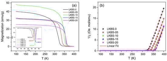 The inverse of magnetic susceptibility of the La0.8−xKxBa0.05Sr0.15MnO3 samples was calculated, and the result can be seen in Figure 4b. A linear trend in the high-temperature region suggests that the La0.8−xKxBa0.05Sr0.15MnO3 samples follow the Curie–Weiss law, defined as []: